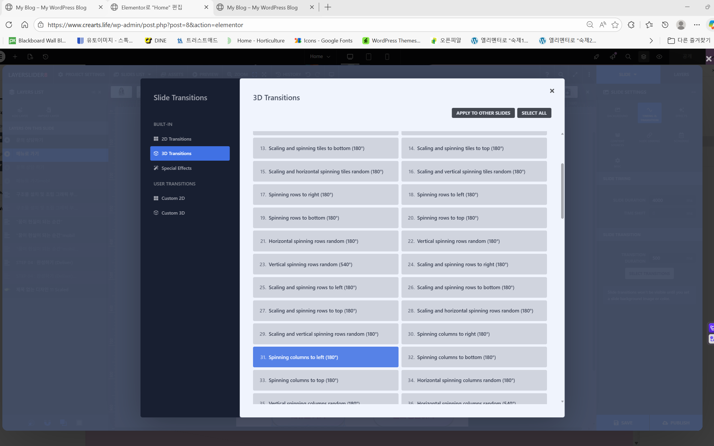 한 가지만 더 물어볼게요. 3D 이펙트 No. 31을 SLIDE/TIMING&TRANSION/SLIDE TRANSITION에서 사용했습니다. 이 효과가 적용되어, 화면이 전환되면 모든 내용물이 사라지고 빈 페이지가 회전합니다. 왜일까요? 예시에서 180도 회전하면 화면의 모든 내용이 기존 상태로 돌아가는데, 내가 적용하면 빈 페이지만 회전합니다. 해결책을 알려주세요