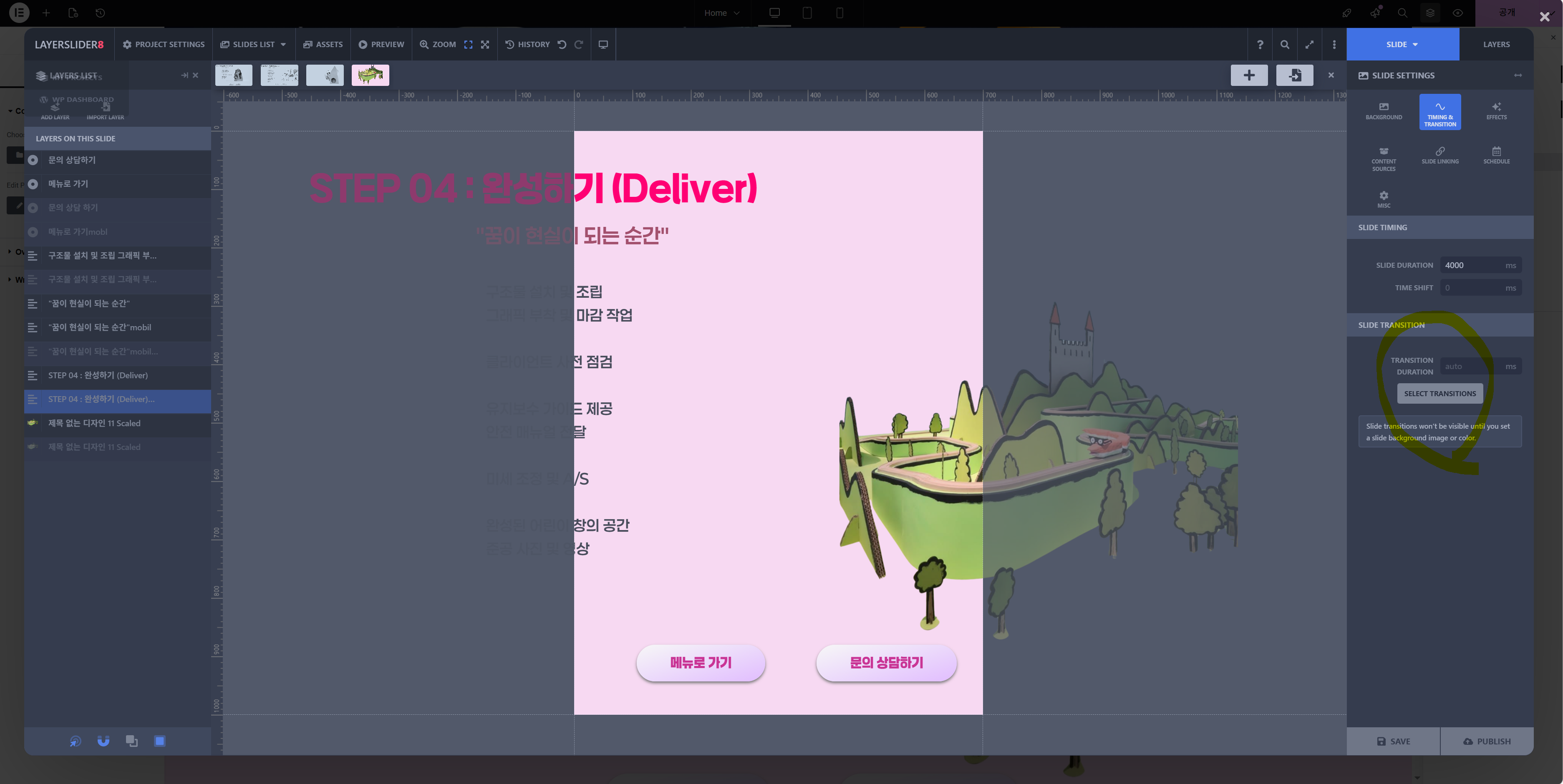 마지막 섹션에서 3D 슬라이더 조작을 없애려고 합니다. 슬라이더 트렌즈를 어디서 삭제할 수 있나요?
